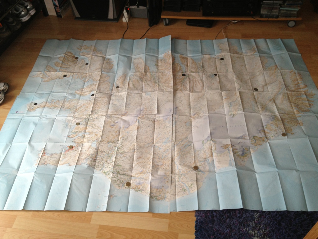 Nå har jeg kjøpt 4 kart som dekker hele landet. Myntene står for mulige overnattingssteder. Her var det 15, men jeg skal være på Island i over tre uker. Da har jeg muligheten til å bli to netter på fine steder eller legge inn noen spontane pauser.